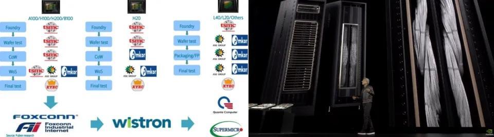 左图为英伟达数据中心产品主要上游供应商,来源Fubon Research ,右图GB200 NV72L机柜的总长接近2英里的NVLink Spine铜缆