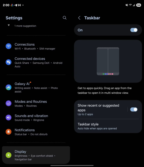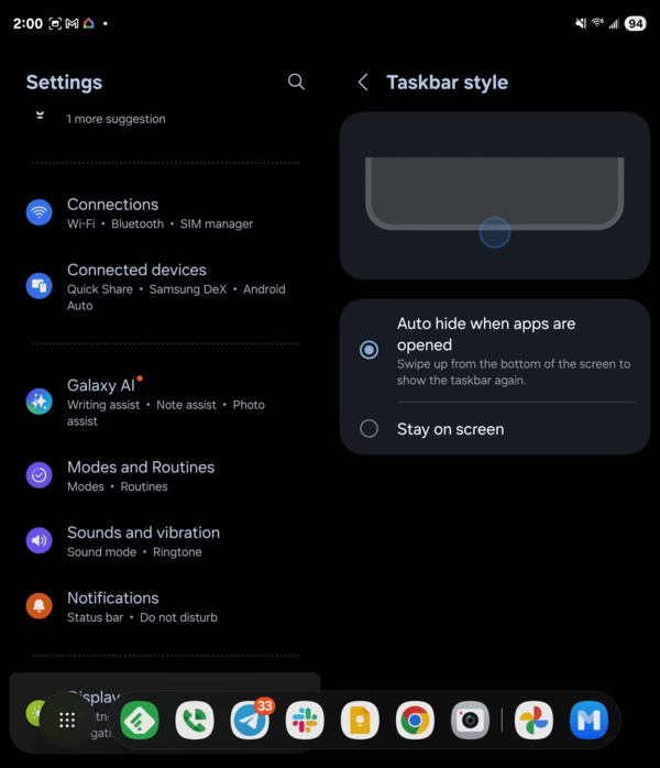 One UI 7还调整了任务栏的显示方式。此前,三星Z Fold6的用户只能选择任务栏始终可见或完全隐藏,而新的测试版增加了自动隐藏模式:任务栏会在打开应用时自动隐藏,提供更整洁的屏幕空间。此外,用户仍可手动设置固定任务栏,保持原有的使用习惯。这种改进让Z Fold6在大屏模式下拥有更沉浸的体验,同时仍能随时快速访问任务栏,兼顾美观和实用性。