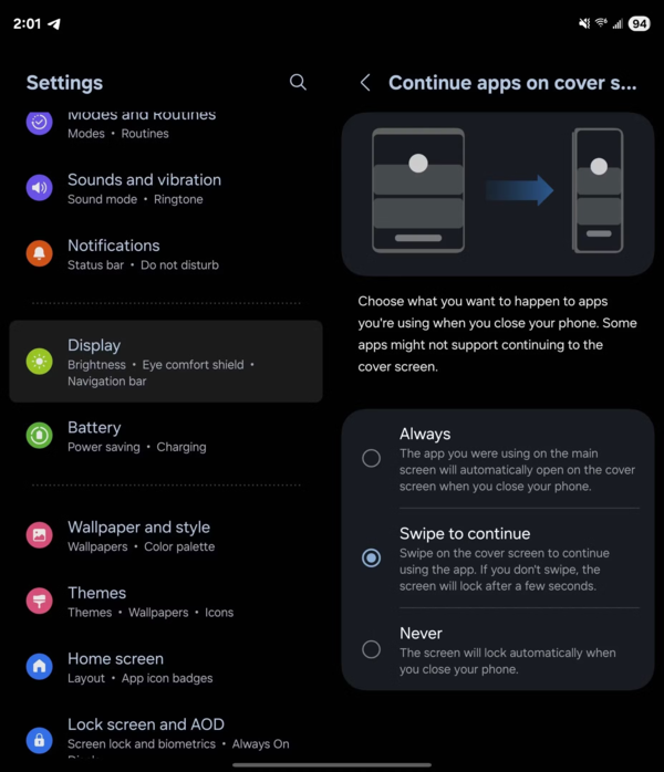 此次One UI 7测试版为三星Z Fold6带来了全新的应用连续性设置,让用户在切换外屏和内屏时能有更灵活的选择。此前,用户需要手动选择哪些应用可以在折叠屏关闭后继续运行,而One UI 7提供了上滑继续、始终保持和从不继续三种更智能的选项,让用户能够在内外屏应用的切换上更加方便。