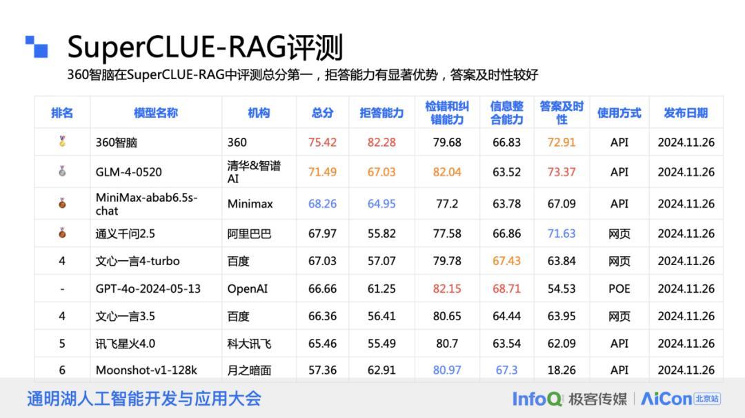 在 SuperCLUE-RAG 的评测中,关注几个关键维度:拒答能力,即模型在没有明确答案时是否能够正确表示“不知道”;检测纠错能力,即模型是否能够针对用户输入进行必要的修正;信息整合能力,特别是在多文档场景下整合多个来源的信息;以及答案的及时性,即模型是否能够访问到最新的知识,避免时效性错误。