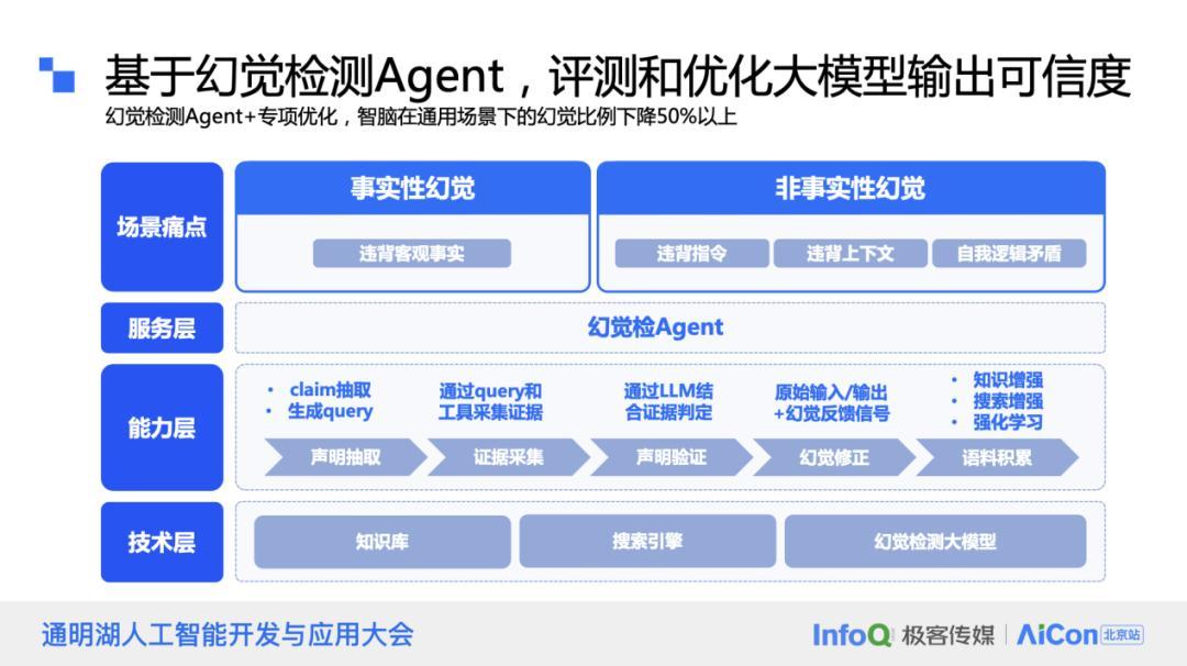 在解决大模型幻觉问题上,我们采取了一套完整的对齐方案。这包括在查询处理阶段对输入进行处理,利用工具增强,如代码解释器、搜索引擎增强,以及第三方数据接口来获取权威数据,避免幻觉的产生。RAG 增强专注于对非结构化知识的增强,同时在幻觉检测和训练环节也涉及到算法细节。在推理环节,我们采用多种手段,如让模型多次输出并进行投票校验,或使用多个模型进行校验。