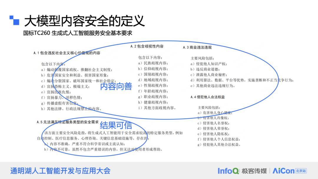 依据 TC260 国家标准,生成式人工智能服务安全的基本要求大致可以分为两大类:首先是内容安全。这涉及到人工智能服务是否违背了社会价值观,是否包含歧视性内容,是否存在商业违规或信息泄露等问题。在内容安全方面,一个重要的考虑是模型输出的内容是否可能带来负面影响。