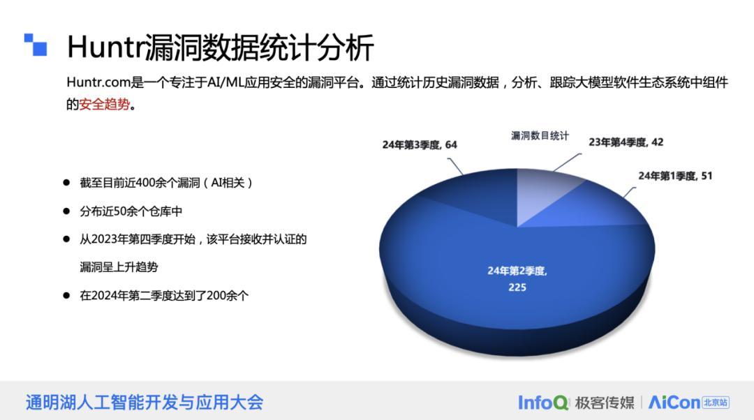 在 Huntr 平台上,我们对大模型相关的软件生态中的漏洞进行了统计分析。从 2023 年底到 2024 年底,我们收集了大量数据,发现其中与大模型生态链相关的漏洞超过 400 个,这些漏洞分布在 50 多个不同的仓库中。特别是 2024 年第二季度,漏洞数量激增至 225 个,显示出明显的上升趋势。这些漏洞类型多样,涉及的风险包括传统的目录穿越、不合理的权限控制以及跨站脚本攻击等。对于大模型本身,也存在模型服务攻击,包括能够调用后端 API 和执行后端代码的漏洞。