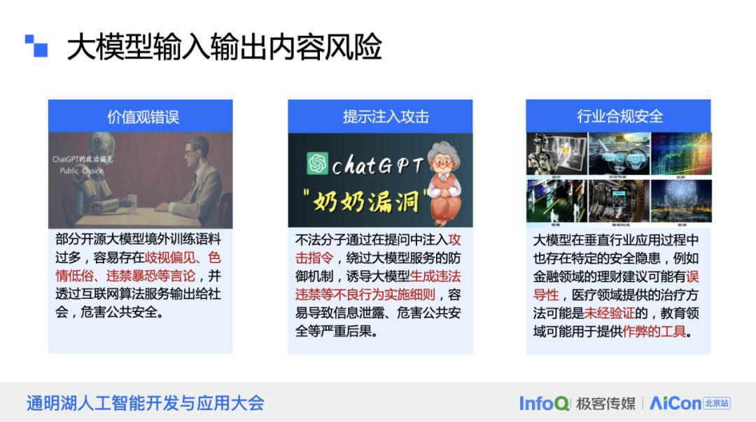 从去年到今年,我们已经看到大模型在多个行业中的应用,尤其是在面向消费者的产品和服务中。人们普遍认识到大模型为业务带来的积极影响,许多客户在购买大模型解决方案时,更倾向于关注它们如何帮助业务发展和解决用户问题。然而,对于大模型背后存在的潜在风险,人们的关注度似乎还不够。360 公司不仅涉足大模型领域,同时也是安全领域的领军企业,因此我们在大模型安全方面投入了相当的精力。今天,我希望能够分享我们在这一领域的一些工作成果。