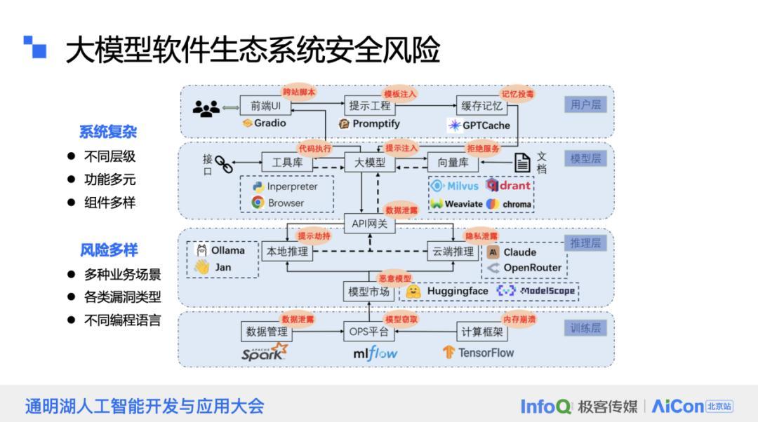 首先是用户层,这一层主要负责与用户的交互,包括前端 UI、提示工程以及缓存系统。其次是模型层,它包含了代码解释器、大模型本身以及依赖的向量库等关键组件。第三层是推理层,这一层主要涉及推理服务,如 Ollama,以及可能存在的隐私泄露风险和模型市场中潜在的恶意模型。最后是训练层,它涉及到底层的数据管理、OPS 平台、计算框架等基础设施。