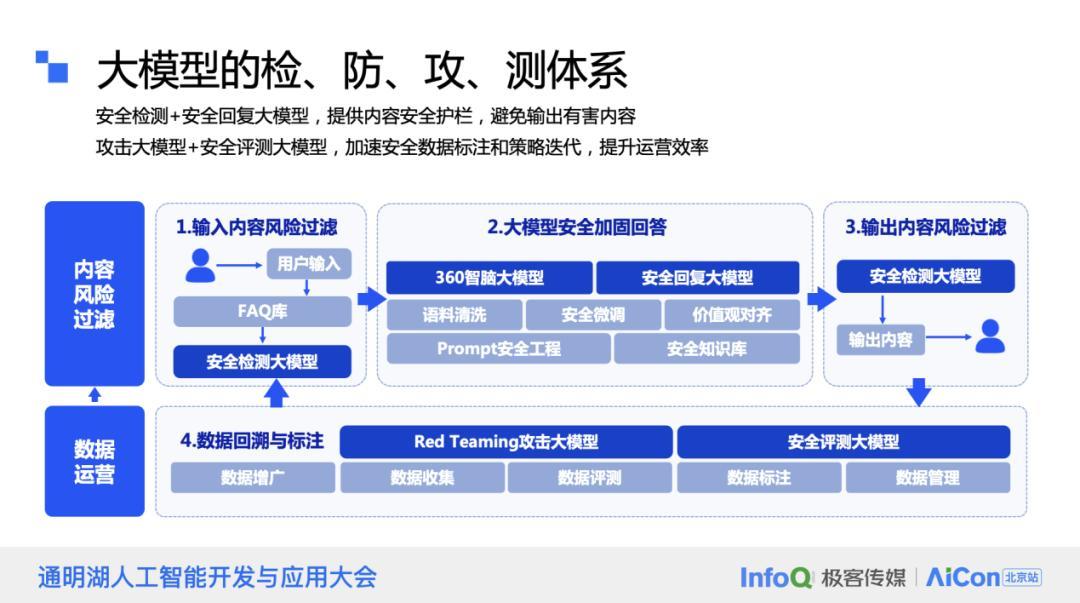 大模型的检、防、攻、测体系构成了一个完整的服务流程,这一流程通过四个关键组成部分来实现:安全检测大模型、安全回复大模型、攻击大模型和安全评测大模型。