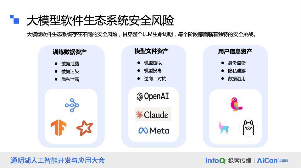 每个环节面临的安全风险都有所不同。在训练环节,我们需要关注数据资产的安全,比如是否存在数据泄露、原始数据是否被投毒或污染,以及是否存在隐私泄露的问题。在模型文件资产方面,我们还需要考虑模型是否会被窃取,以及是否存在模型投毒、逆向和对抗等问题。在最终的服务环节,用户信息资产的安全也至关重要,比如是否存在身份盗窃、隐私泄露、账号泄露等问题,以及数据是否被滥用。此外,我们还需要关注模型输出内容的合规性,以及是否被用于违规或违法的场景。