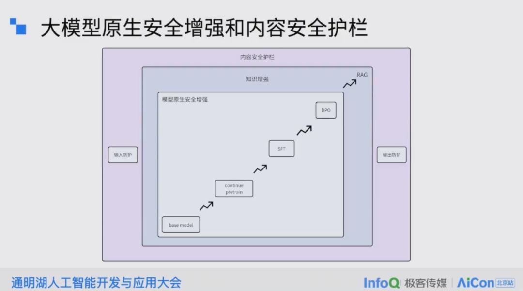 通过一张简化的图,我们可以展示这个流程:最内层是模型的原生安全增强,中间层是知识增强,即模型在请求时参考更优质的语料库,最外层是内容的安全护栏,包括输入和输出层面的防护。