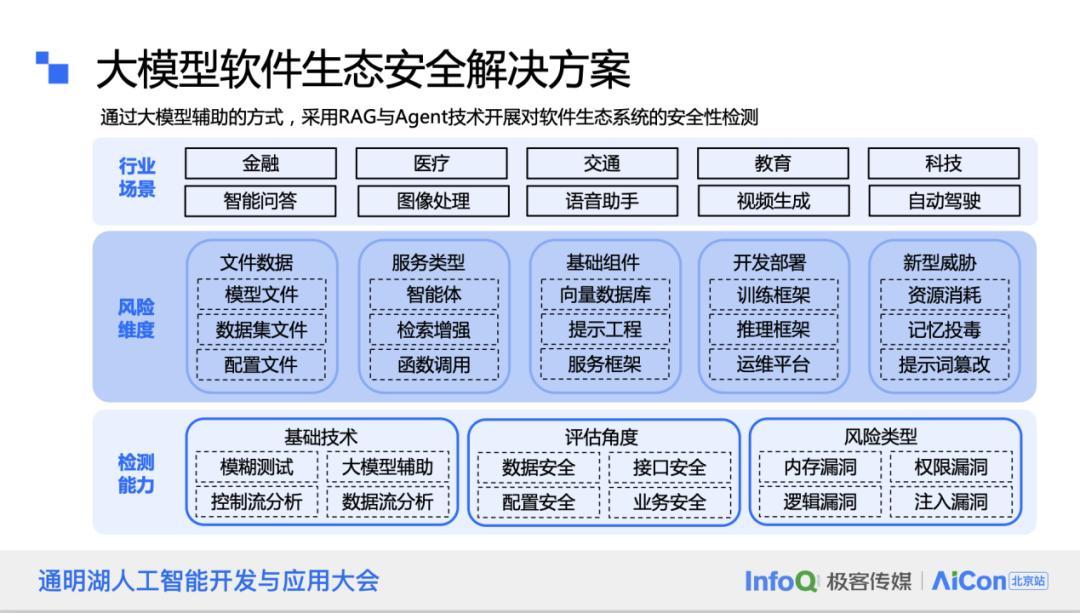 大模型软件生态安全涉及众多环节的复杂系统。为了确保这一生态系统的安全性,我们采取了包括 RAG 和 Agent 方案在内的多种策略来增强底层防护能力。我们的检测技术基础广泛,涵盖了模糊测试、控制流分析和数据流分析等关键领域。这些技术从多个角度进行评估,包括数据安全、接口安全、配置安全以及业务安全。我们关注的风险类型不仅包括传统漏洞,也包括针对大模型的新型威胁。