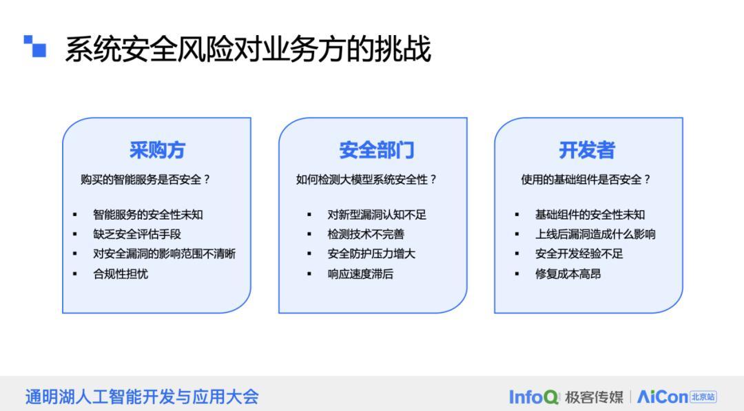 不同的业务方面临着各自独特的问题和挑战。对于采购方来说,他们最关心的问题是他们所购买的智能服务是否安全。在很多情况下,他们可能没有进行充分的评估,也缺乏必要的安全评估手段。他们对安全漏洞可能带来的影响范围并不清晰,同时,合规性问题也是他们担忧的一个方面。安全部门同样面临挑战。他们需要检测大模型系统的安全性,但对新型漏洞的认知不足,检测技术也不完善。