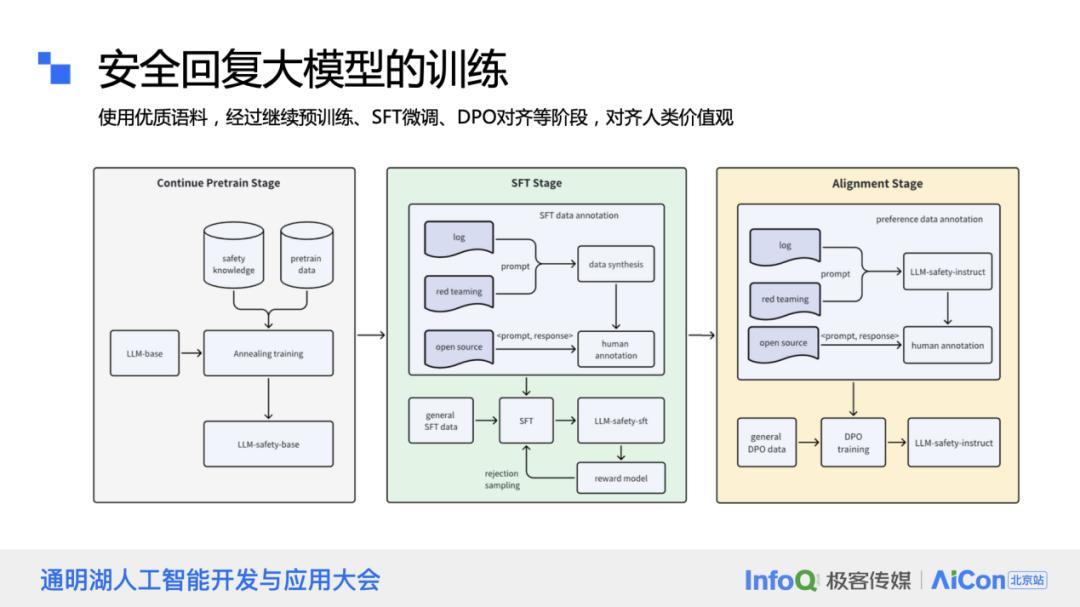 在构建安全回复的大模型时,训练和微调的方法与常规手段相似,但关键在于拥有优质的语料库。国内有官方媒体和权威网站提供的丰富优质语料,以及一些开源语料库,这些都是训练语料的宝贵资源。在安全的对齐阶段,我们会进行更细致的工作,重点在于标注和数据增强,包括红蓝对抗攻击的模拟,以增强模型的安全性。