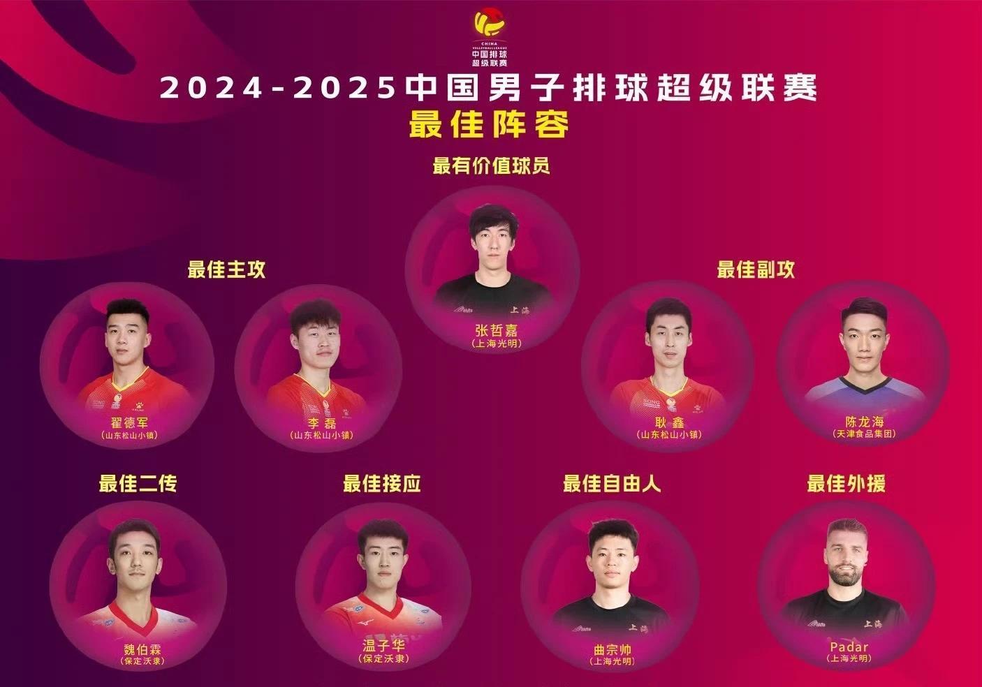 本赛季男排超级联赛的最佳阵容,由中国排协和联赛组委会根据联赛数据统计和联赛前四名俱乐部队伍各个位置进行综合评价后选出。除张哲嘉外,本赛季联赛最佳阵容中的自由人和外援同样出自上海队,他们分别是男排国手曲宗帅和匈牙利外援帕达尔。最佳副攻由山东男排35岁的耿鑫与天津男排34岁的陈龙海两位老将当选,他们用实际行动诠释了“宝刀未老”的真谛,在网前与年轻选手的竞争中,两人的表现毫不逊色,用丰富的经验与精湛的技术为本赛季男排联赛增添了亮色。