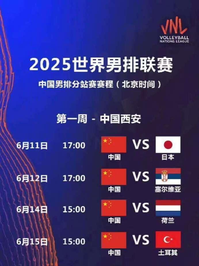 2025年世界男排联赛分站赛将于2025年6月11日至7月20日举行,中国男排将先后参加中国西安、美国芝加哥、波兰格但斯克站的比赛,为争取晋级7月底开战的联赛总决赛而努力。