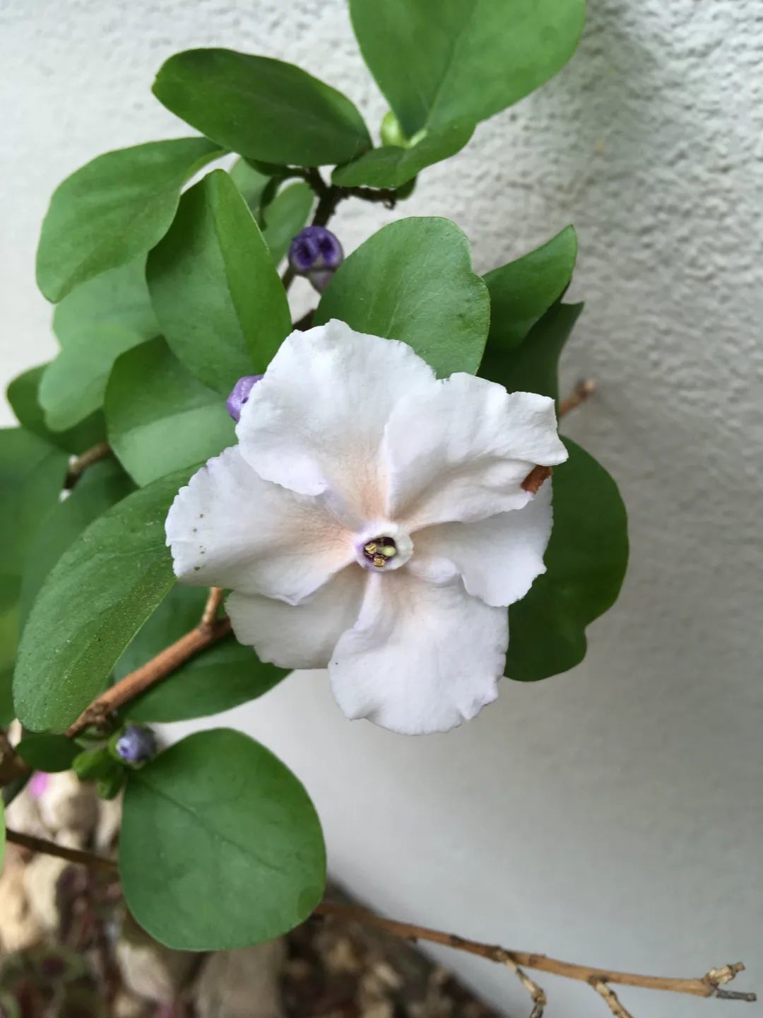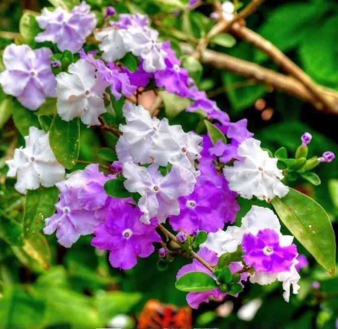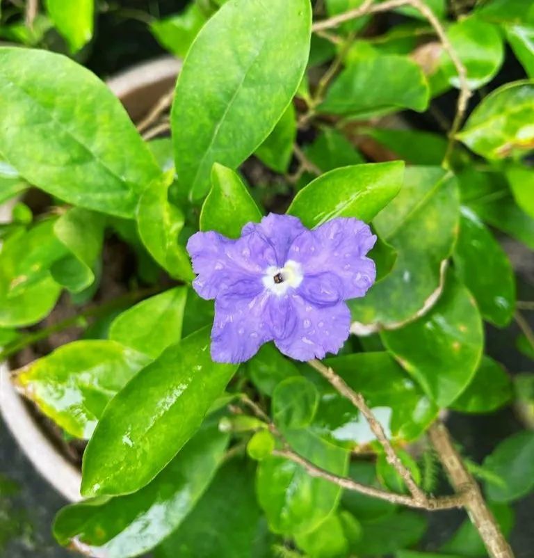 鸳鸯茉莉也叫双色茉莉,它的花朵初开的时候是淡紫色的,慢慢会变成紫色,等花朵快要开败时就会变成白色,整棵植株上每一朵花的开花时间不一样,就会导致一颗植株上有白色或紫色的花朵,此为名字的由来。