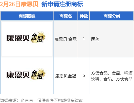 证券之星消息,根据企查查数据显示,近日浙江康恩贝制药股份有限公司新提交“康恩贝 金冠”、“康恩贝金冠”等6件商标注册申请。商标申请详情如下: