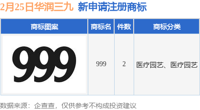 证券之星消息,根据企查查数据显示,近日华润三九医药股份有限公司新提交“999”等2件商标注册申请。商标申请详情如下: