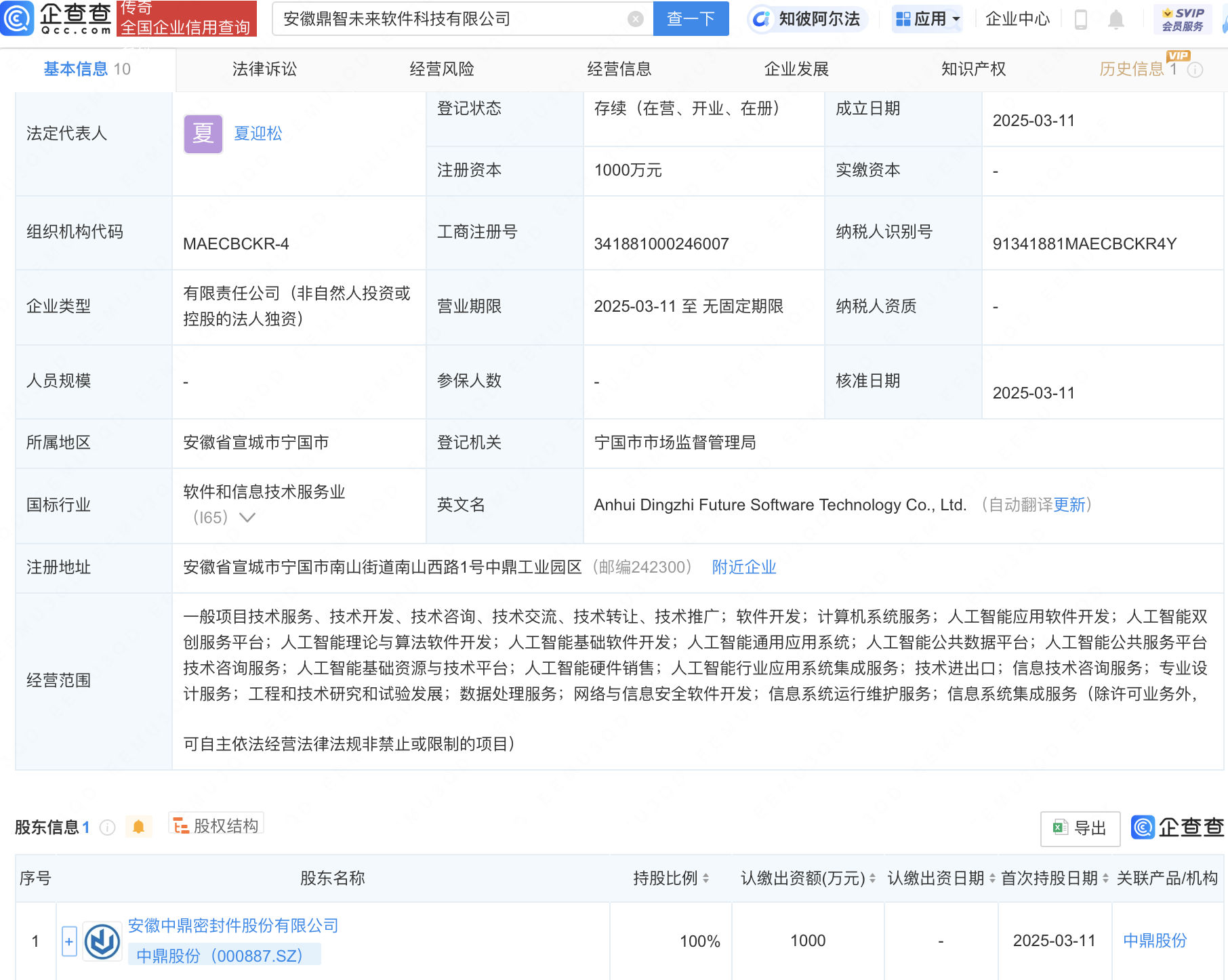 企查查APP显示,近日,安徽鼎智未来软件科技有限公司成立,法定代表人为夏迎松,经营范围包含:人工智能应用软件开发;人工智能双创服务平台;人工智能理论与算法软件开发;人工智能基础软件开发;人工智能通用应用系统;人工智能公共数据平台等。企查查股权穿透显示,该公司由中鼎股份(000887)全资持股。