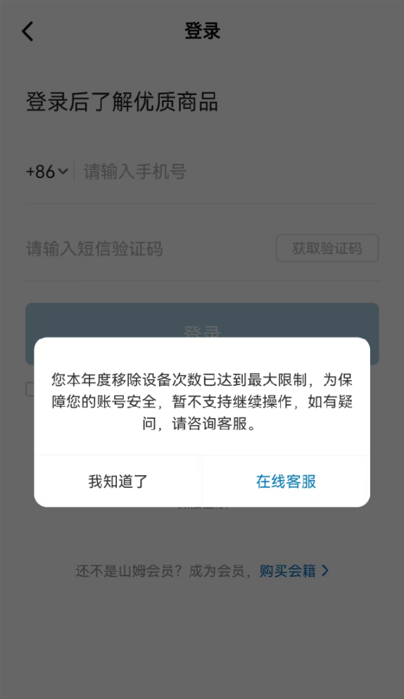 后来,当孙女士把用不习惯的鸿蒙系统退回到安卓系统,再想登录山姆时,发现界面显示为“当前登录设备已达上限”,她尝试用格式化的旧手机重新登录,也没有成功。