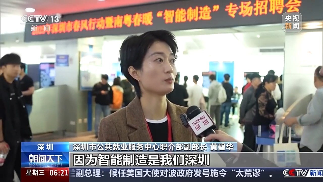 深圳市公共就业服务中心职介部副部长 黄碧华:因为智能制造是我们深圳产业升级和经济发展的重要方向,截至目前我们系列的招聘活动已经举办了近80场。
