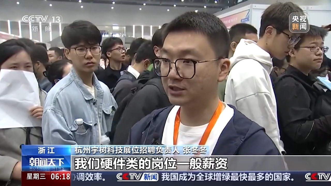杭州宇树科技展位招聘负责人 张冬冬:我们硬件类的岗位一般薪资普遍是在20到40(千元)左右月薪,再加上年终(奖金)部分可能最高有六七十万的样子。