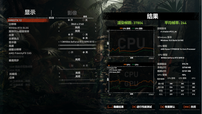 古墓丽影暗影的测试中,游戏帧数达到244,同样是4K分辨率,最高特效,带给玩家非常出色的游戏性能表现。