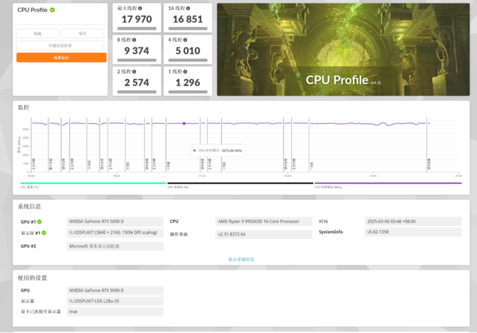 CPU Profile的测试中可以看到,9950X3D的游戏性能表现优秀,单线程跑分为1296,最大线程跑分为17970。