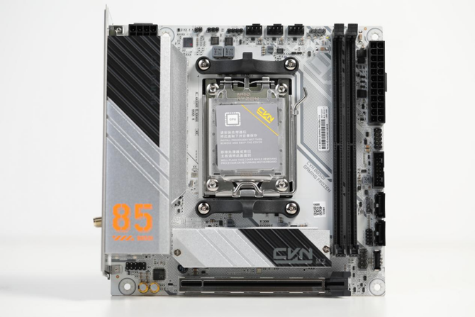 散热一直是小体积ITX主板需要重点解决的问题,而CVN B850I登陆舰在这方面表现出色。其寒霜散热模组采用了多重工艺打造,包括斜向散热纹路、分区装甲和复合沟槽设计,能够有效提高散热效率。