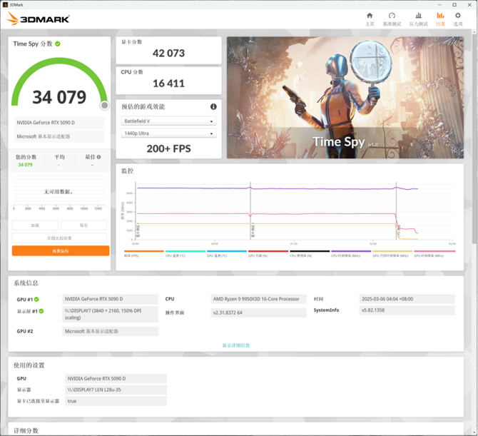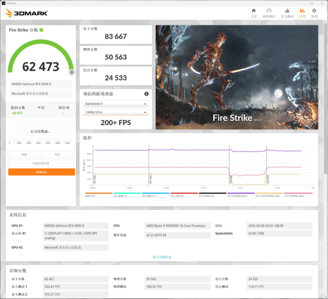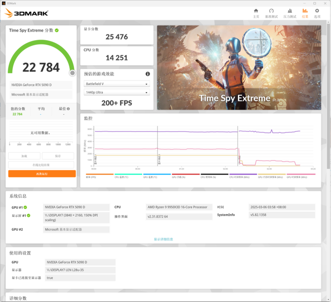 3DMARK的跑分中,我们可以看到,搭配上RTX 5090D,游戏性能非常优秀,能够实现2K高帧率的游戏表现,理论游戏性能表现非常优秀。