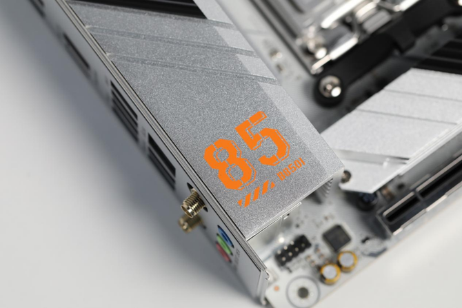 此外,主板还配备了独立的PCIe 5.0 M.2固态散热装甲,能够有效降低固态硬盘在高负载读写时的温度,保障数据传输的稳定性和安全性。