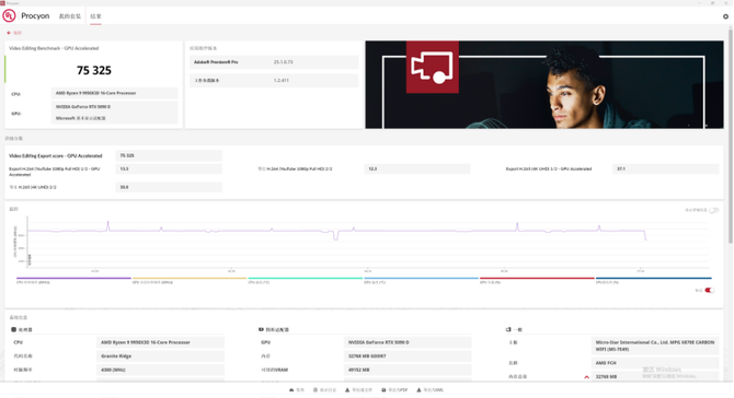 而在UL Procyon的视频编辑测试中,开启GPU加速,整套平台的跑分来到了75325,能够轻松应对绝大部分的PR视频剪辑工作。