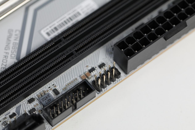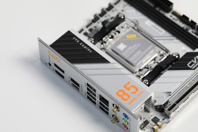 CVN系列一直以独特的军工元素和星舰概念著称,而CVN B850I GAMING FROZEN V14登陆舰更是将这种设计理念发挥到了极致。全白色PCB搭配银色的寒霜散热装甲,整体呈现出一种冷酷而科技感十足的视觉效果。