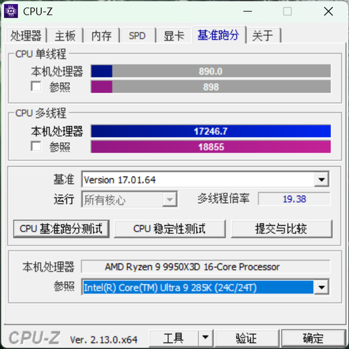 CPU-Z的测试中可以看到,七彩虹CVN B850I GAMING FROZEN V14登陆舰能够稳定发挥其性能,整体性能和酷睿Ultra 9 285K保持一致。