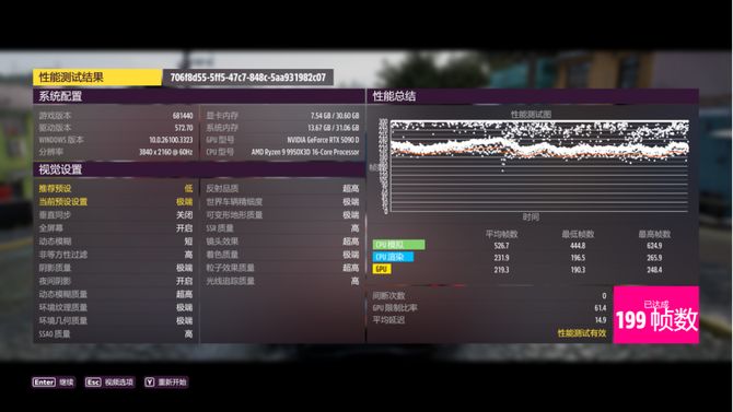 地平线5游戏性能测试中,我们可以看到,整套平台的游戏帧数达到199,4K游戏毫无压力。