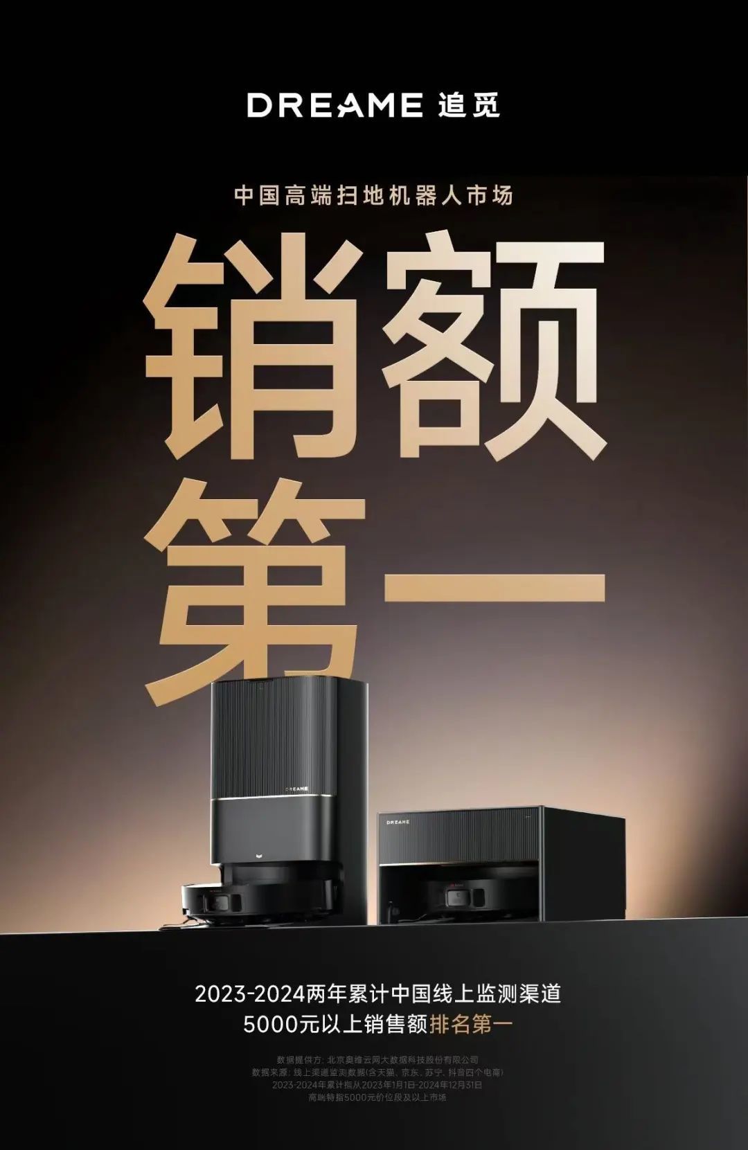 这种聚焦技术创新带来的研发红利,正成为追觅产品力及品牌力的双重势能。奥维云网统计数据显示,追觅扫地机器人获得“中国高端扫地机器人市场销额行业第一”认证,在2023-2024两年累计线上监测渠道5000元以上销售额排名第一。