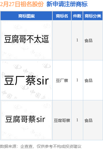 证券之星消息,根据企查查数据显示,近日祖名豆制品股份有限公司新提交“豆腐哥蔡”、“豆厂蔡”等3件商标注册申请。商标申请详情如下:
