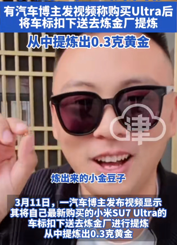 近日,小米SU7 Ultra的24K金碳纤维车标在网络上掀起了一股热议。一位博主发布视频称,他将自己新购的小米SU7 Ultra车标抠下并送去提炼,结果从中成功提炼出了0.3克黄金。根据目前的金价,这些黄金大约相当于200元人民币。这一发现引起了不少网友的调侃:“终于知道这个车标的含金量了。”