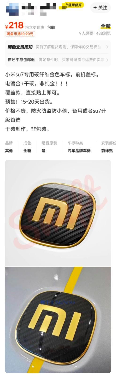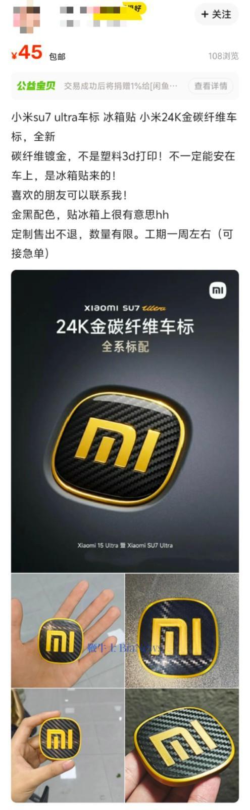 随着小米SU7 Ultra车标的走红,这款原本价值2000元的车标,在二手平台已能买到“平替”。鞭牛士查看发现,“平替”车标价格几十元至百元不等。