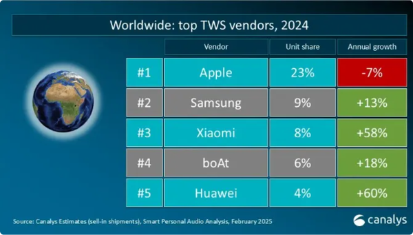 根据Canalys最新数据,2024年全球真无线耳机(TWS)市场出货量达到3.3亿台,同比增长13%,恢复了两位数增长。三星作为全球第二大真无线耳机出货商,整体出货量达到2800万台,同比增长13%,占据9%的市场份额。