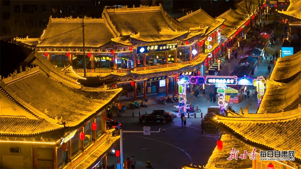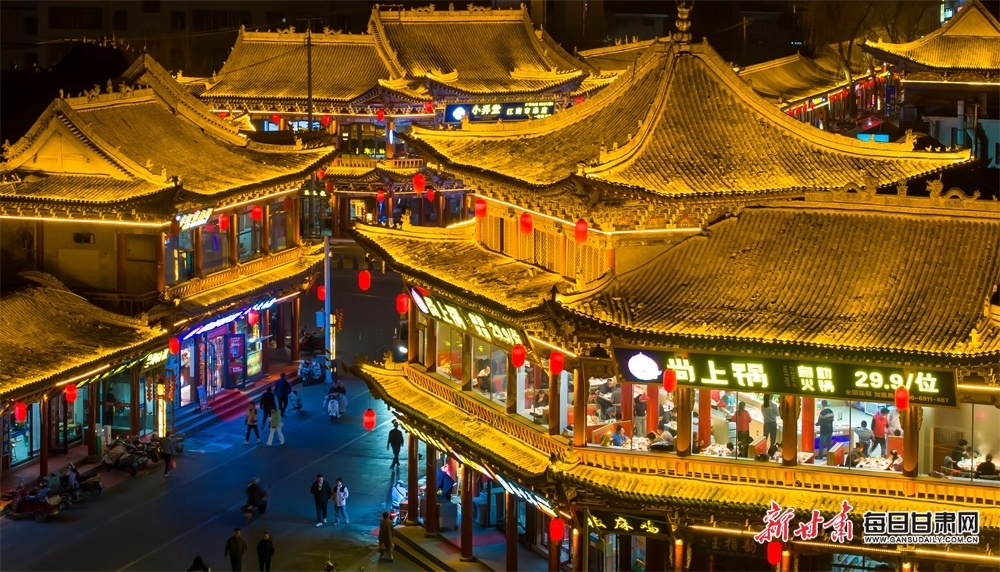 3月10日,张掖市甘州区明清老街,游客在灯光璀璨的老街品尝特色美食、购买特色文创产品。