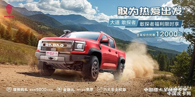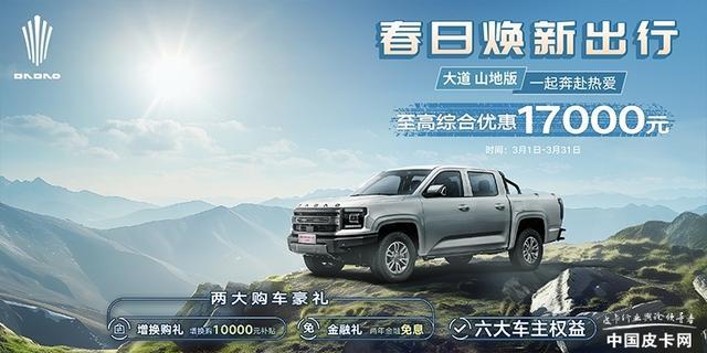 在江铃皮卡方面,同样截止至3月31日,购买大道全能者、追光者、敢探者、大道山地版以及域虎7车型也均可以享受到一定幅度的让利活动。其中,购买追光者、全能者以及敢探者可享受5000元增换购补贴、两年金融免息,至高综合优惠达1.2万元;大道山地版可享10000元增换购补贴、两年金融免息,至高综合优惠达1.7万元。