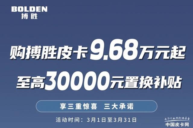针对中国重汽搏胜皮卡,官方也推出了相当多的福利政策。包括全系4000元贷款补贴、云服务及2年4G流量、整车3年/6万公里质保、首任车主发动机终身质保等。此外,考虑置换购买搏胜皮卡牧野型的消费者还可以享受至高3万元的置换补贴。而需要提醒您的是,以上提到的活动时间为均在3月31日截止。