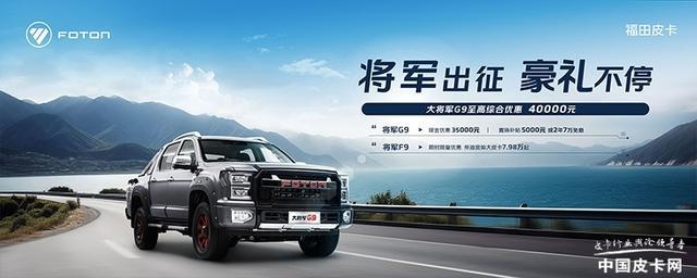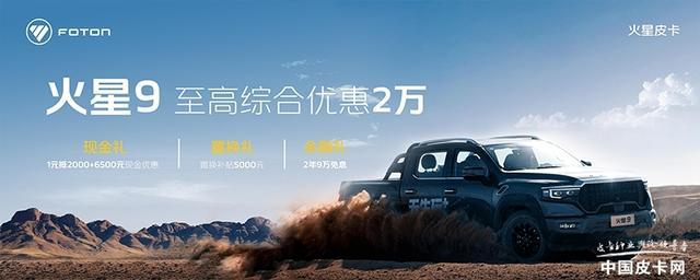 福田皮卡近期的优惠活动主要集中在火星9以及将军系列部分车型上。以官网公布的消息来看,近期购买火星9可享受1元抵2000+6500现金优惠,5000元置换补贴以及2年9万免息利,至高综合优惠可达2万元。而将军系列的优惠则包括了G9与F9两款车型,其中购买G9车型可享3.5万元现金优惠,5000元置换补贴或2年7万免息金融福利;购买F9则可享受7.98万元起的限量限时优惠价格。