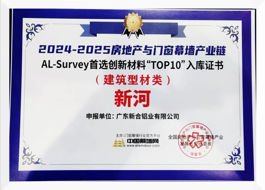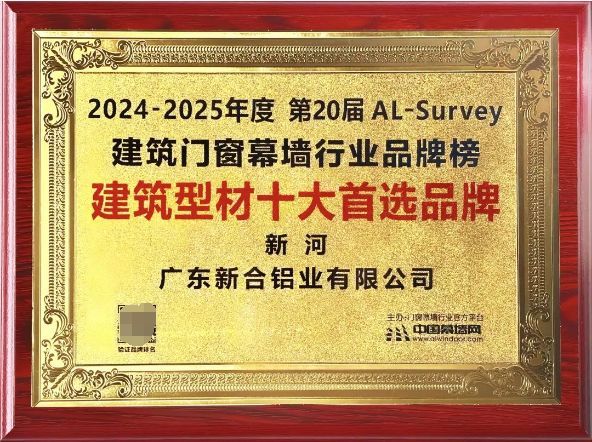 2025年3月11日,第 31 届门窗幕墙新产品展销会在广州・保利世贸博物馆盛大开幕。其中,新河铝材凭借卓越的品质与不懈的努力,成功入选中国建筑铝型材前五强!此外,新河铝材还荣获家装铝材制造业单项冠军以及AL-Survey首选创新建筑型材TOP10!。这不仅是行业对新河铝材多年来深耕行业的高度认可,更是其迈向新征程的坚实基石。