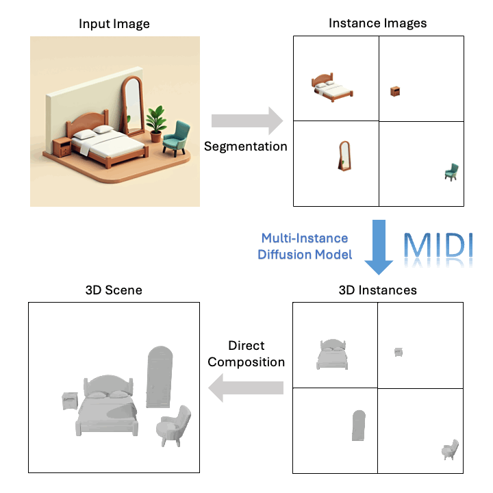 传统的组合式 3D 场景重建技术往往依赖于多阶段的逐个物体生成和场景优化,流程冗长且生成的场景往往几何质量低、空间布局不准确。为解决这些问题,MIDI (Multi-Instance Diffusion Model)创新性地利用了三维物体生成模型,将其扩展为多实例扩散模型,能够同时生成具有精确空间关系的多个 3D 实例,实现了高效高质量的 3D 场景生成: