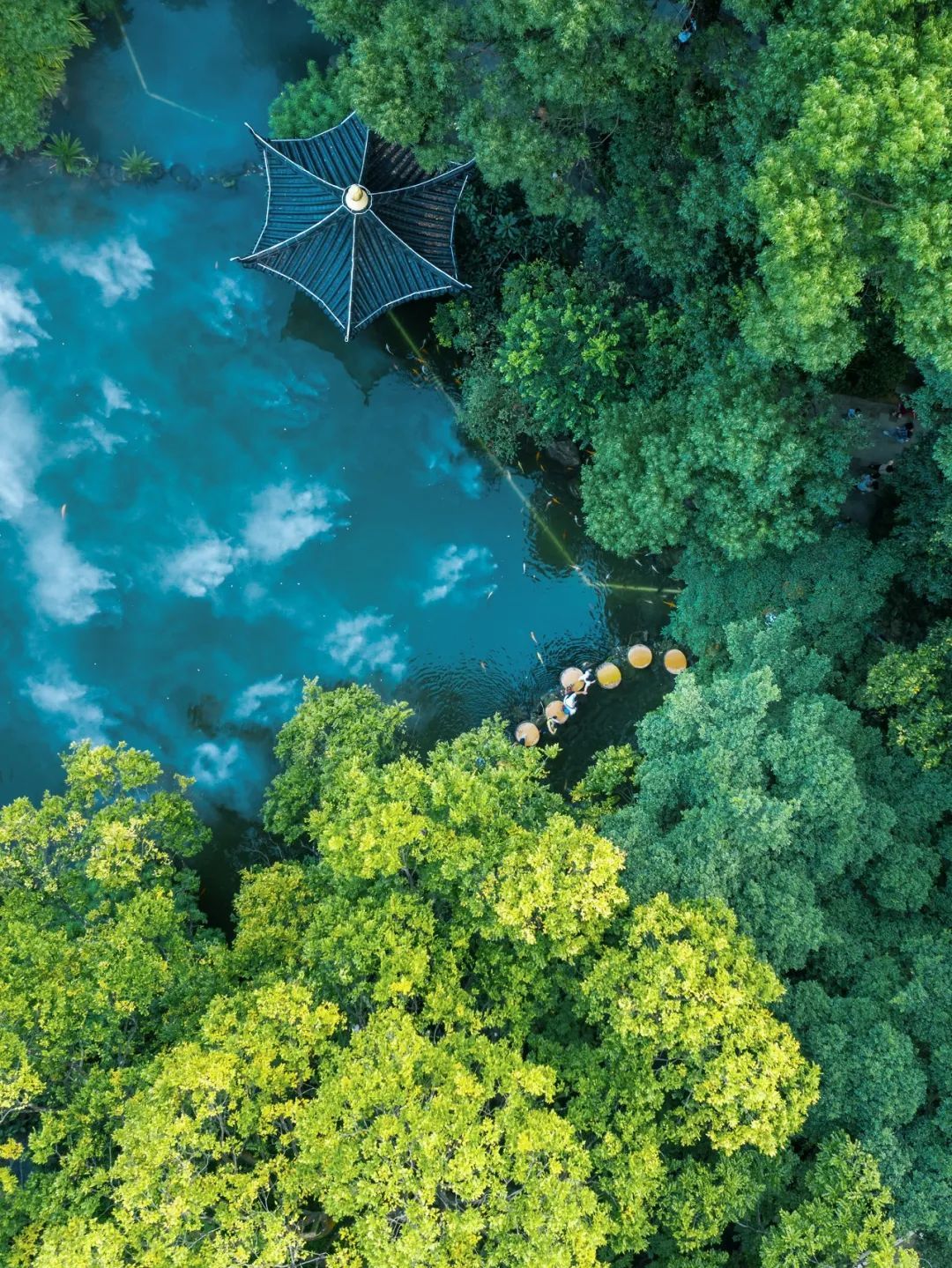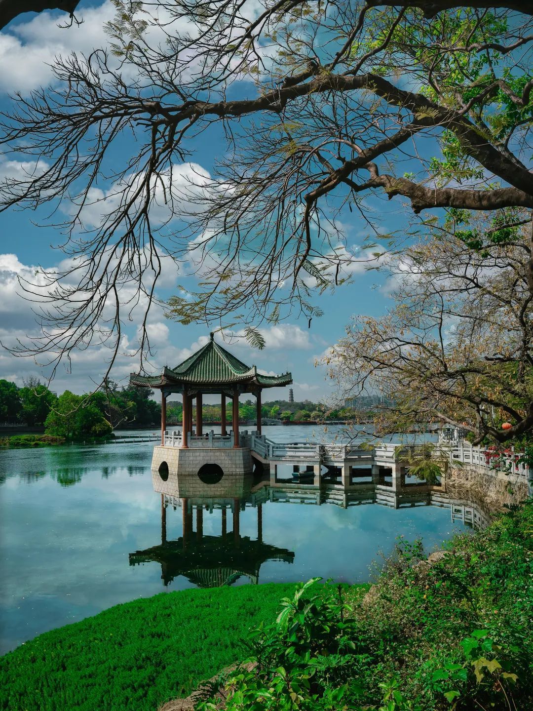 九曲桥连接的不仅是亭台楼阁,更是从吴冠中水墨画走向苏东坡诗境的时空隧道。缓步桥上,感受“一步一景”的园林设计,远眺泗洲塔与苏堤。