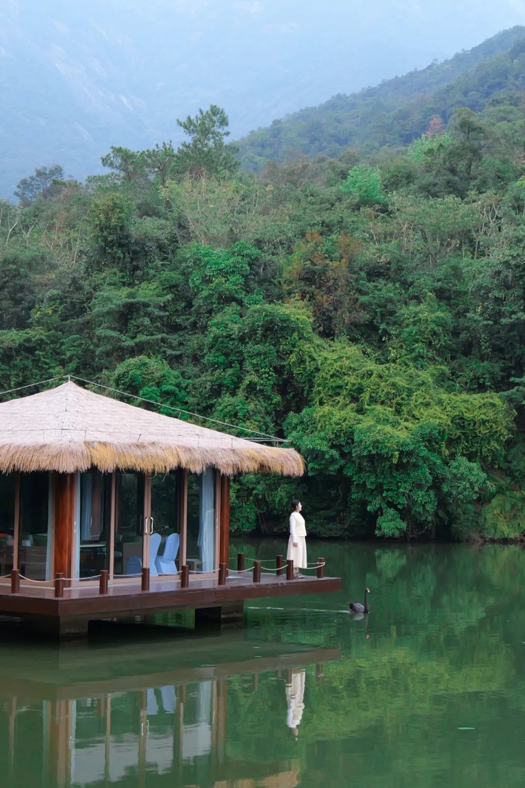 再往深处去就是天心湖罗浮胜景,一路盘山公路上去,天晴时云雾缭绕山顶,就像给罗浮山戴上了一顶“奶盖帽”。湖上的黑天鹅夫妻带着了4只可爱小宝宝,在水上悠哉游哉的,好看又温馨。