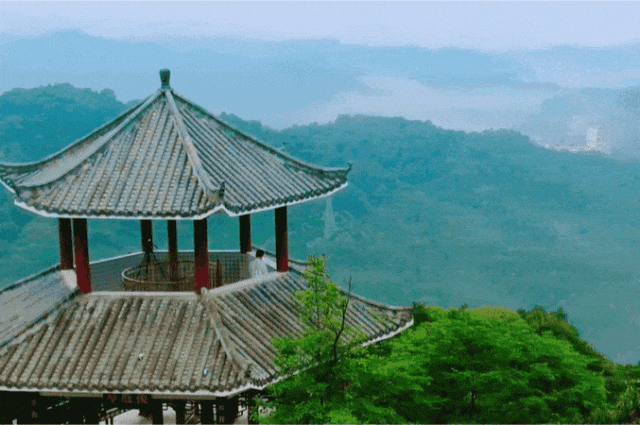 在九重远眺台上,远近景色尽收眼底,山峦叠嶂,重重皆绿。漫山遍野的竹林,风吹竹动,沙沙作响。村舍房屋点缀其间,构成了一幅幅动人的自然画卷。
