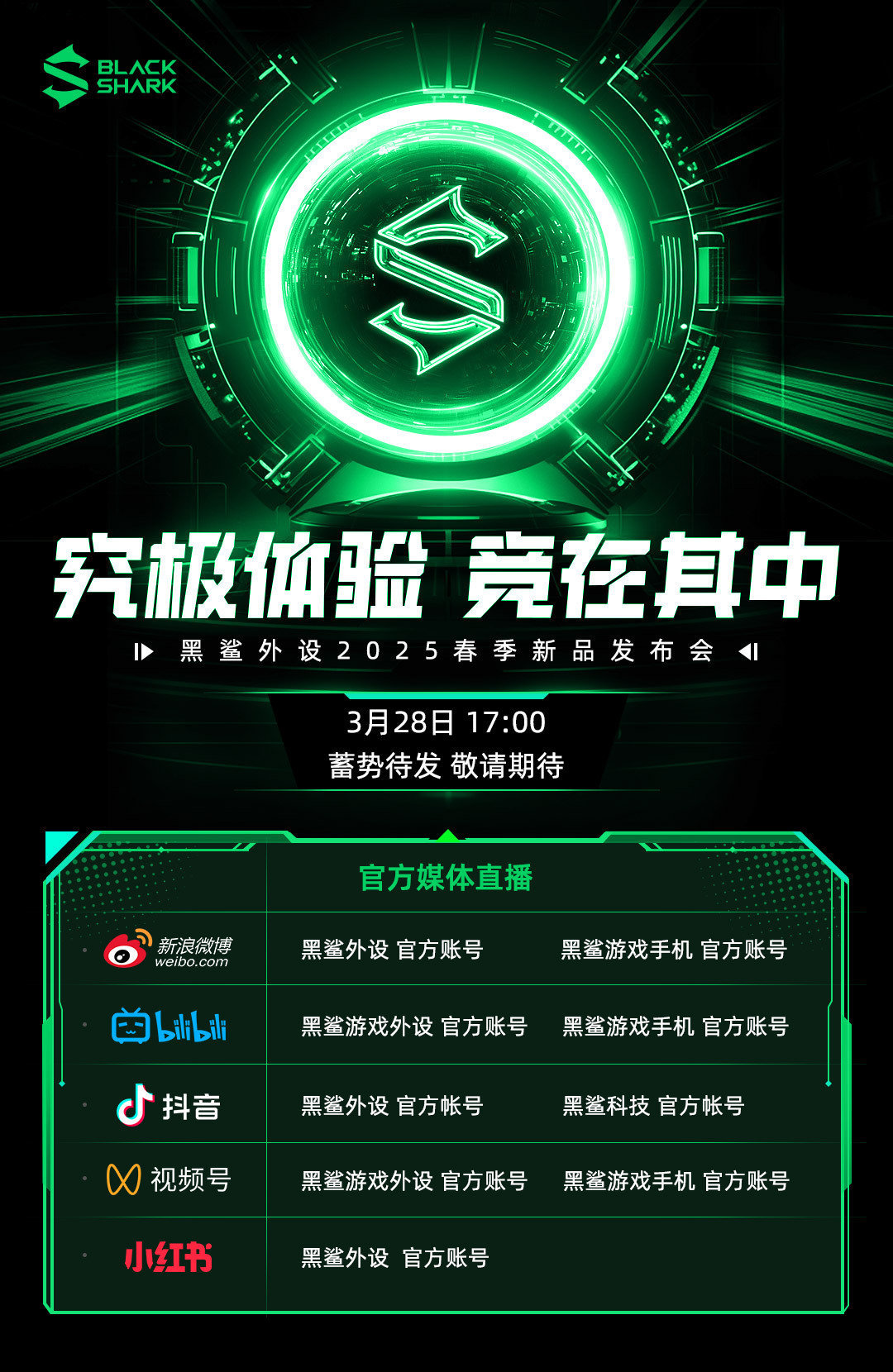 3 月 14日消息,黑鲨外设官方发文官宣将于3 月 28 日17:00召开黑鲨外设 2025 春季新品发布会。