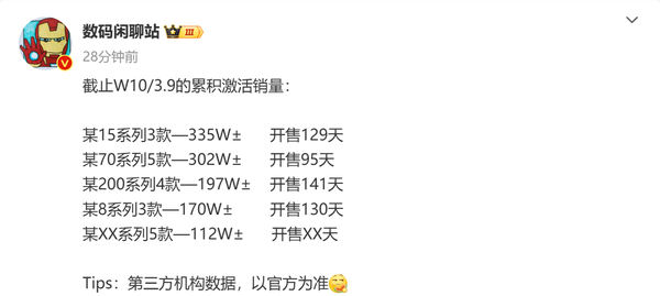 【CNMO科技消息】最新数据显示,截止2025年第10周(3月9日),小米15系列累计激活销量约335万部、华为Mate 70系列累计激活销量约302万部、vivo X200系列累计激活销量约197万部、OPPO Find X8系列累计激活销量约170万部。此外,疑似荣耀Magic 7系列累计激活销量约112万部。