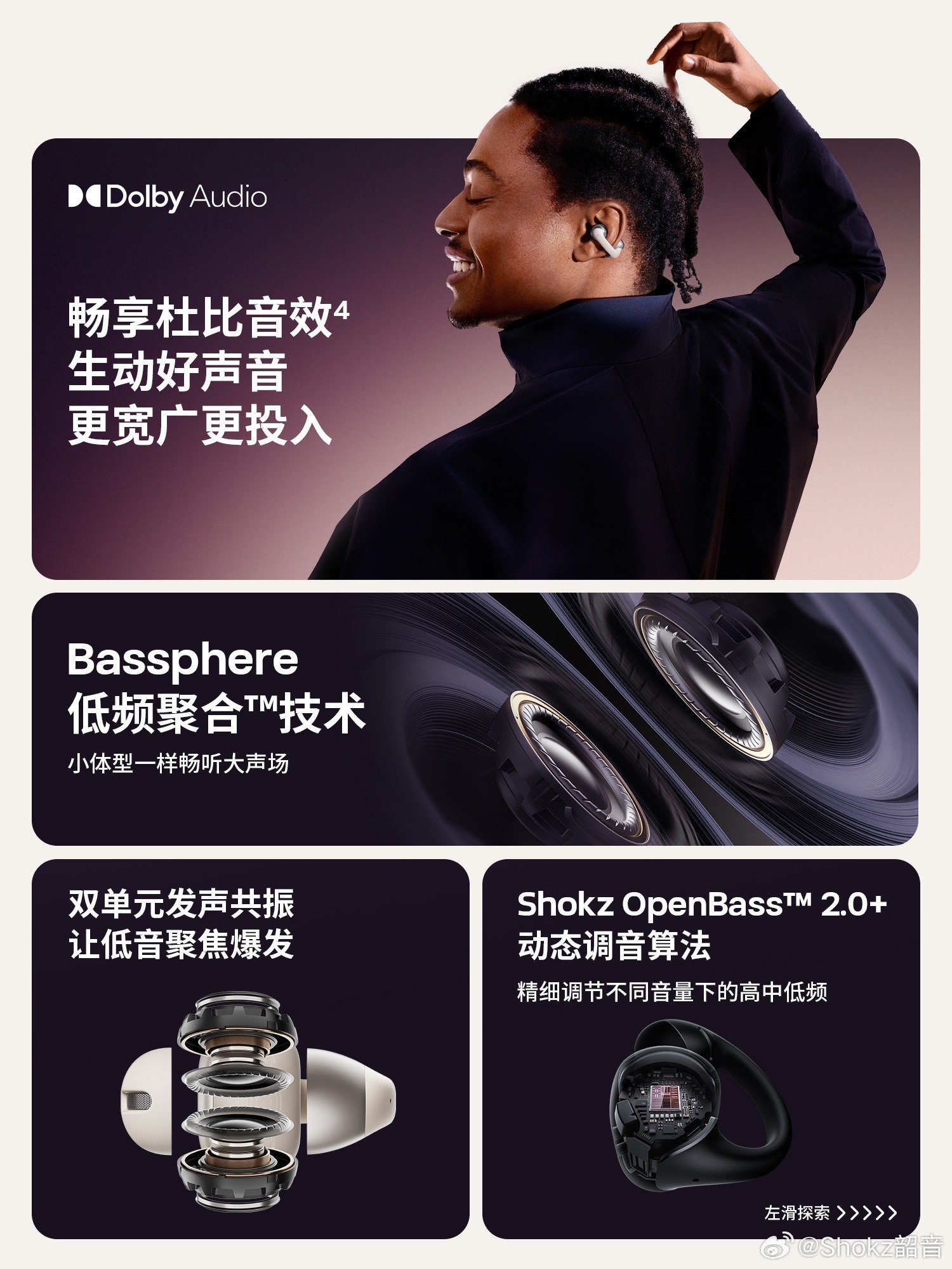 声音方面,韶音 OpenDots ONE 采用了双单元发声共振的技术,并且还支持了杜比音效和低频聚合技术,可以带来宽广的声场表现。